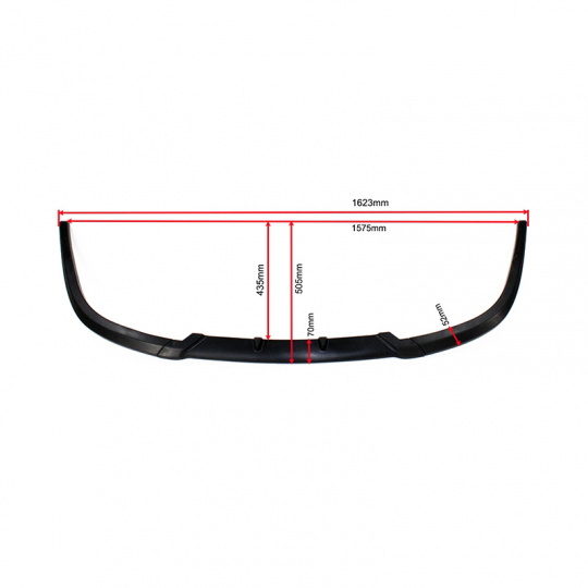 Jedná se 3-dílný univerzální spoiler, vyrobený z černého matného plastu. Přesné rozměry uvedeny v obrázcích. Spoiler se dá do určité míry natvarovat či přizpůsobit danému nárazníku a přišroubovat šroubky, které jsou součástí balení.