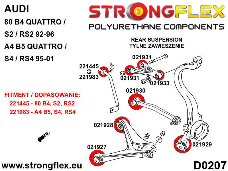- Tato sada je dostupná pouze v tvrdosti 90ShA (žlutá), protože původní gumový silentblok je vyroben z tvrdé gumové směsi. Použití silentbloku s tvrdostí 80ShA (červený) by snížilo jízdní vlastnosti vozu na úroveň původního gumového silentbloku.
