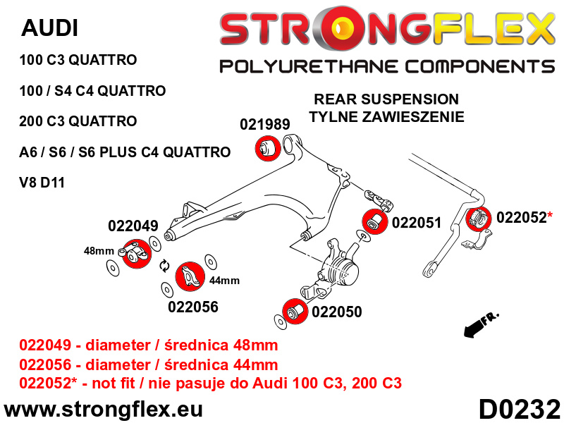 - Pokud máte Audi 100 C3 nebo 200 C3, vyberte "-" v poli 022052. Pro generaci C3 nenabízíme zadní silentbloky stabilizátoru.