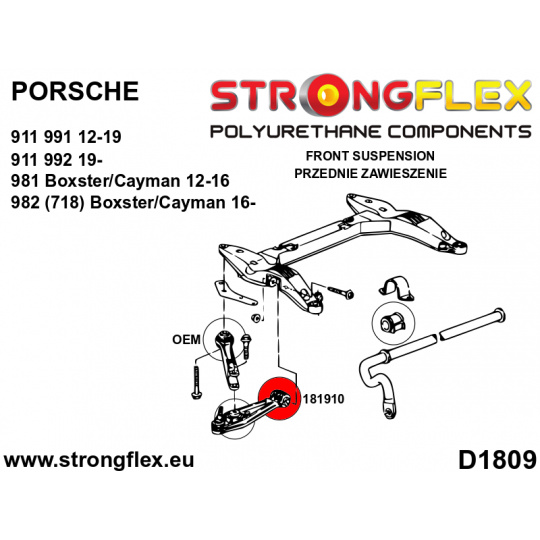 Porsche Boxster / Cayman 982 (718) (16-) - Tento silentblok je dostupný pouze v tvrdosti 90ShA (žlutý), protože původní gumový silentblok je vyroben z tvrdé gumové směsi. Použití silentbloku s tvrdostí 80ShA (červený) by snížilo jízdní vlastnosti vozu na úroveň původního gumového silentbloku.