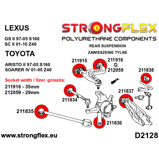 Pokud máte rameno s 35mm širokým pouzdrem, vyberte silentbloky 211916. - Tento silentblok je dostupný pouze v tvrdosti 90ShA (žlutá), protože originální gumový silentblok je vyroben z tvrdé gumové směsi. Použití silentbloku s tvrdostí 80ShA (červená) sníží jízdní vlastnosti vozu na úroveň originálního gumového silentbloku.
