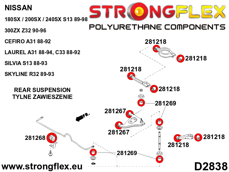 - Existují dva různé silentbloky předního ramene: ?34mm (281263) a ?38mm (281397).