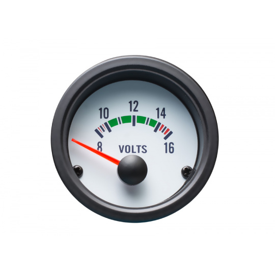 Auto Gauge přídavný voltmetr s rozsahem od 8 do 16 V s bílým pozadím a červenou ručičkou v klasickém youngtimer stylu.