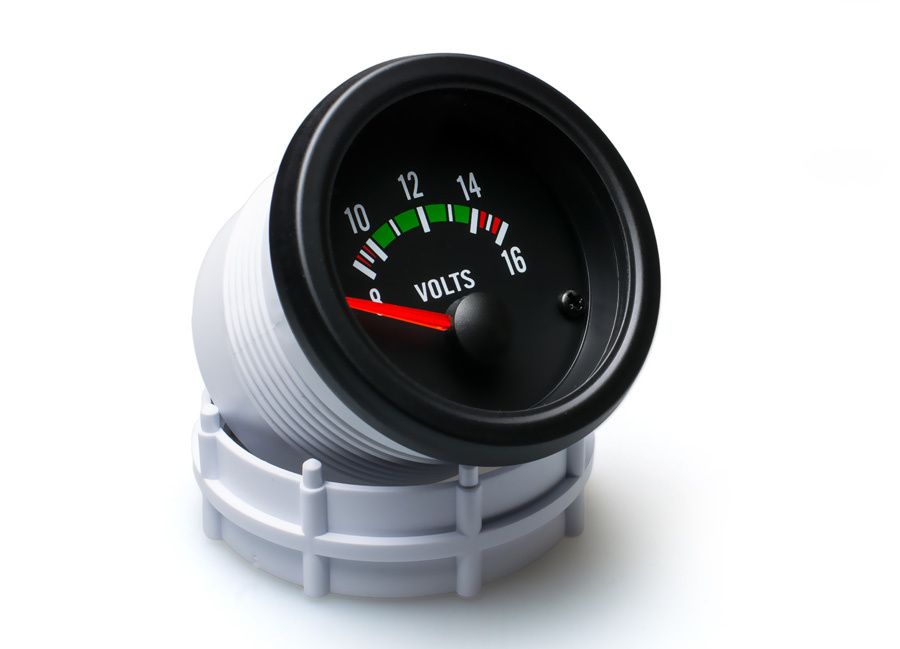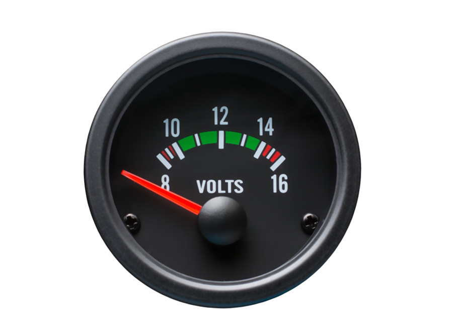 Auto Gauge přídavný voltmetr s rozsahem od 8 do 16 V s černým pozadím a červenou ručičkou v klasickém youngtimer stylu.