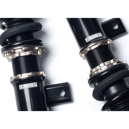 Výška se nastavuje šroubováním celého těla tlumiče, aniž by docházelo ke zkrácení dráhy tlumení nebo změně předpětí pružiny. Rozsah snížení se liší podle typu vozu – od téměř sériové výšky až po extrémní snížení nevhodné pro běžný silniční provoz. - Nastavení tuhosti