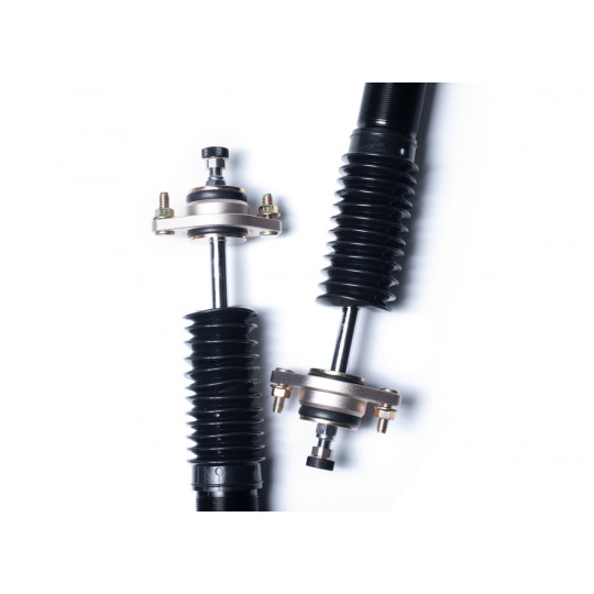 Výška se nastavuje šroubováním celého těla tlumiče, aniž by docházelo ke zkrácení dráhy tlumení nebo změně předpětí pružiny. Rozsah snížení se liší podle typu vozu – od téměř sériové výšky až po extrémní snížení nevhodné pro běžný silniční provoz. - Nastavení tuhosti