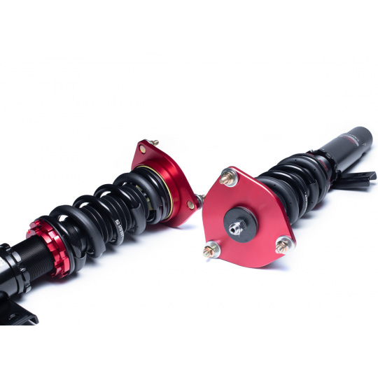 Výška se nastavuje šroubováním celého těla tlumiče, aniž by docházelo ke zkrácení dráhy tlumení nebo změně předpětí pružiny. Rozsah snížení se liší podle typu vozu – od téměř sériové výšky až po extrémní snížení nevhodné pro běžný silniční provoz. - Nastavení tuhosti