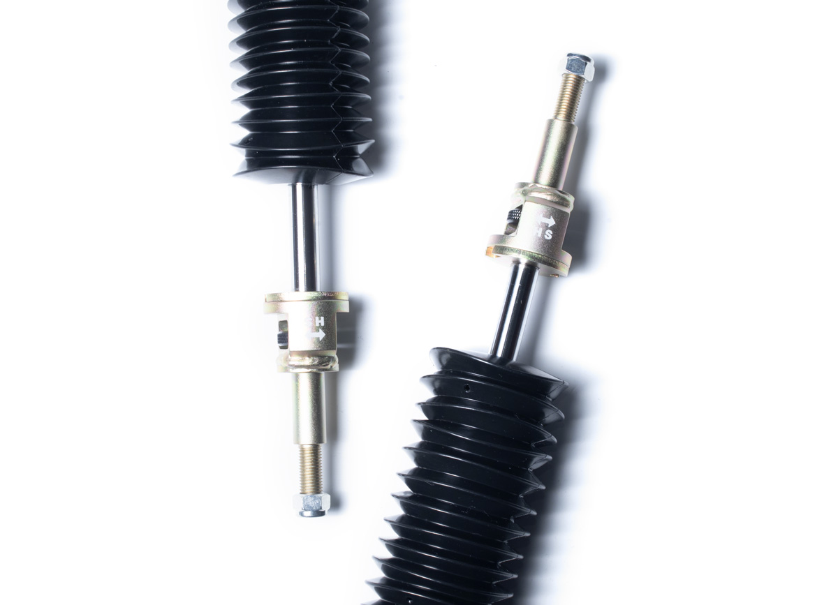 Výška se nastavuje šroubováním celého těla tlumiče, aniž by docházelo ke zkrácení dráhy tlumení nebo změně předpětí pružiny. Rozsah snížení se liší podle typu vozu – od téměř sériové výšky až po extrémní snížení nevhodné pro běžný silniční provoz. - Nastavení tuhosti