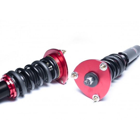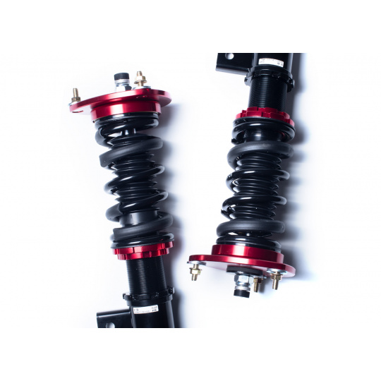 Výška se nastavuje šroubováním celého těla tlumiče, aniž by docházelo ke zkrácení dráhy tlumení nebo změně předpětí pružiny. Rozsah snížení se liší podle typu vozu – od téměř sériové výšky až po extrémní snížení nevhodné pro běžný silniční provoz. - Nastavení tuhosti