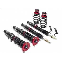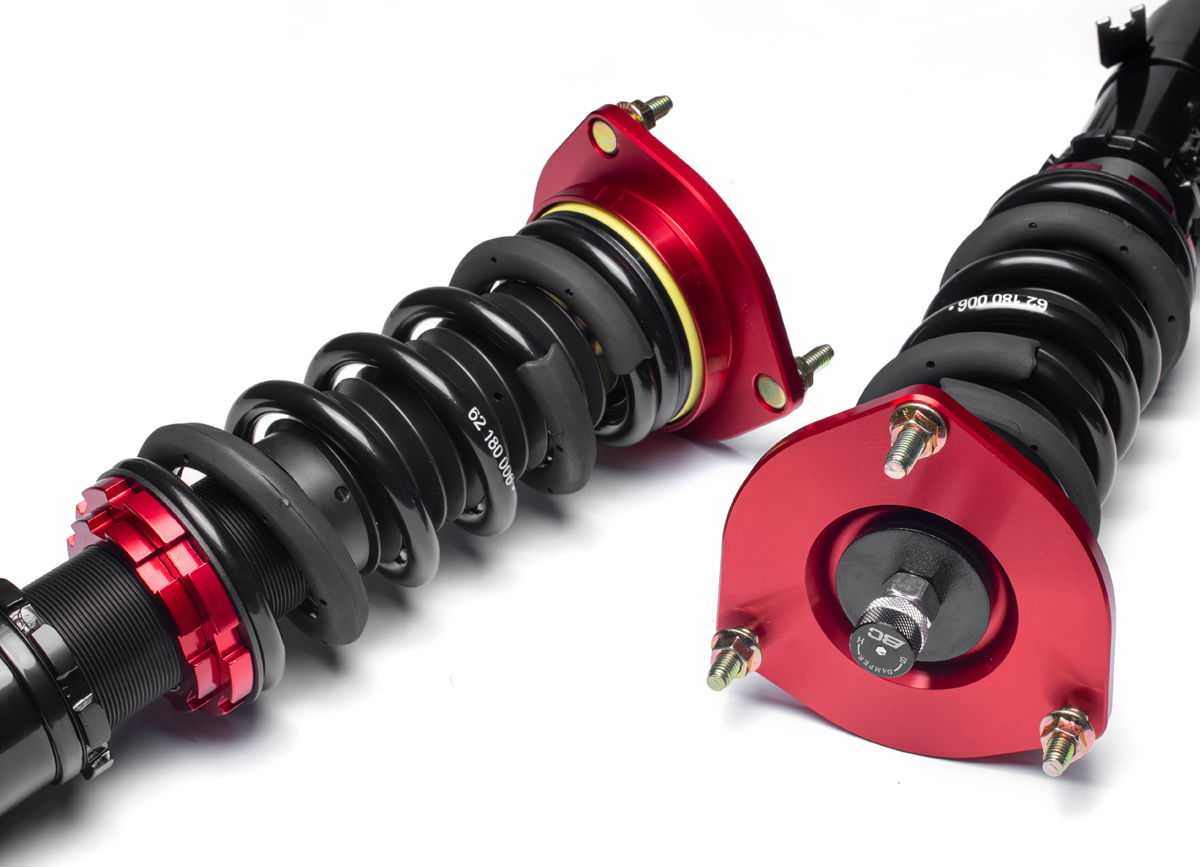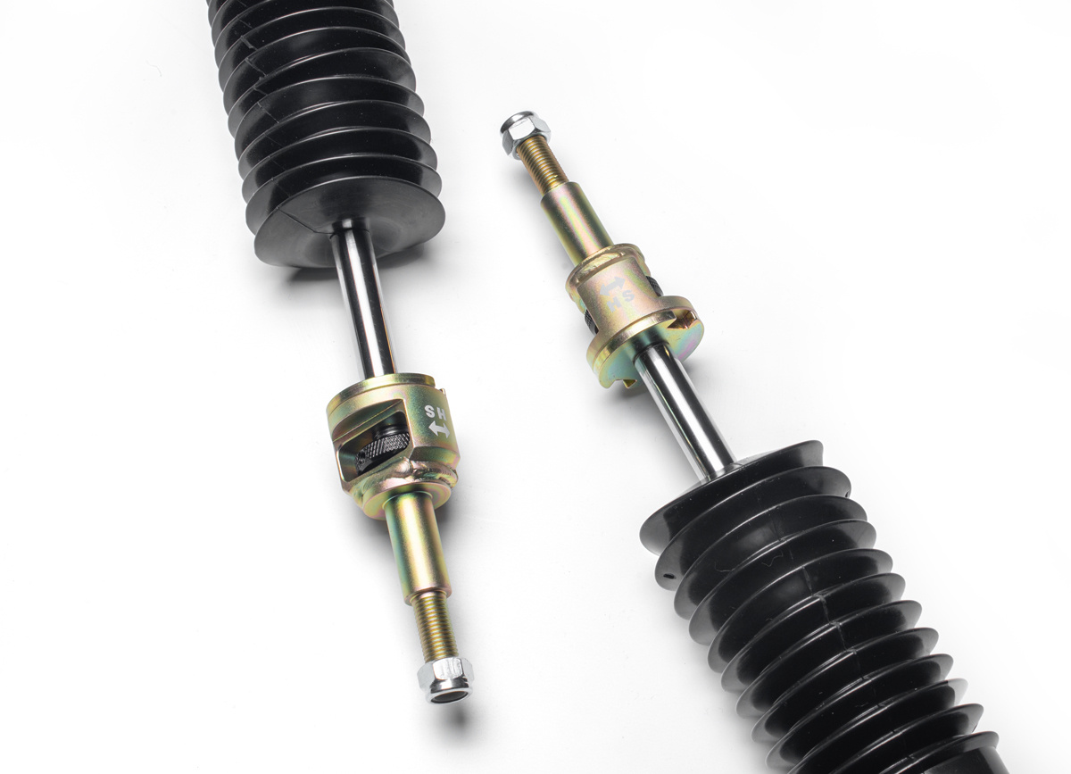 Výška se nastavuje šroubováním celého těla tlumiče, aniž by docházelo ke zkrácení dráhy tlumení nebo změně předpětí pružiny. Rozsah snížení se liší podle typu vozu – od téměř sériové výšky až po extrémní snížení nevhodné pro běžný silniční provoz. - Nastavení tuhosti