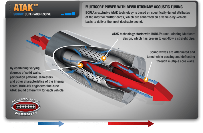Borla ATAK je nejhlasitější verze výfuků Borla, která vyniká vysokou agresivitou zvuku a ostrým tónem. Výfuky ATAK jsou určeny zejména pro ty, kteří milují hlasité, agresivní a ostré zvukové projevy při každém sešlápnutí plynu.