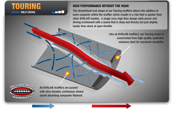 Provedení Borla Touring nabízí nejnižší úroveň hlučnosti v nabídce značky Borla. Oválný tvar tlumičů poskytuje větší kapacitu pro tlumicí náplň, díky čemuž je zvuk tišší než u ostatních modelů Borla. Konstrukce tlumiče zároveň umožňuje vyšší průchodnost a nárůst výkonu při hlučnosti jen mírně převyšující sériový výfuk.