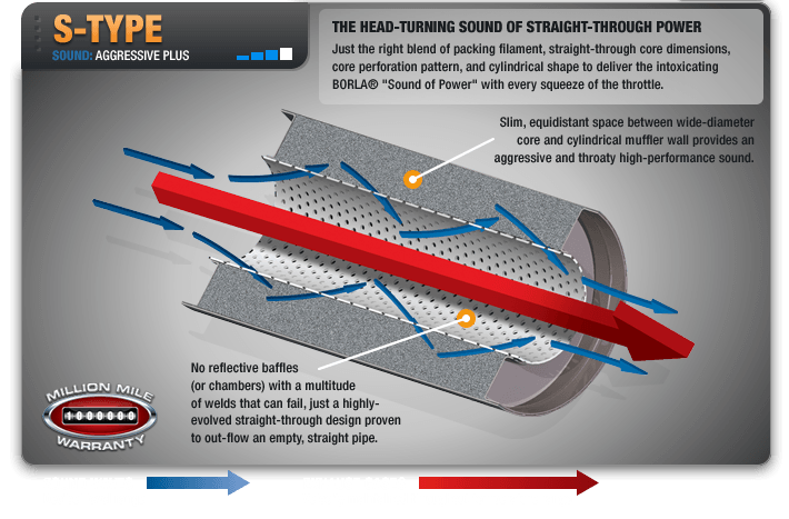 Provedení Borla S-Type představuje střední úroveň hlasitosti v nabídce značky Borla.Nabízí agresivní zvukový projev s výraznými hlubokými tóny při každém sešlápnutí plynu.Je určeno pro řidiče, kteří chtějí hlasitý a hluboký projev výfuku bez extrémní agresivity varianty ATAK.