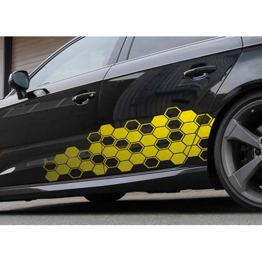 Designový polep FOLIATEC – motiv HEXAGON dodá vašemu vozu moderní a technický vzhled. Samolepky jsou vyrobeny z vysoce odolné exteriérové fólie, snadno se instalují a vydrží i náročné podmínky.