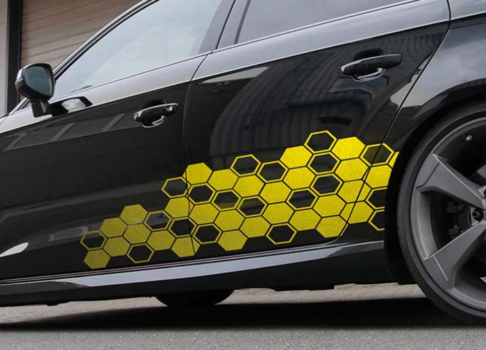 Designový polep FOLIATEC – motiv HEXAGON dodá vašemu vozu moderní a technický vzhled. Samolepky jsou vyrobeny z vysoce odolné exteriérové fólie, snadno se instalují a vydrží i náročné podmínky.