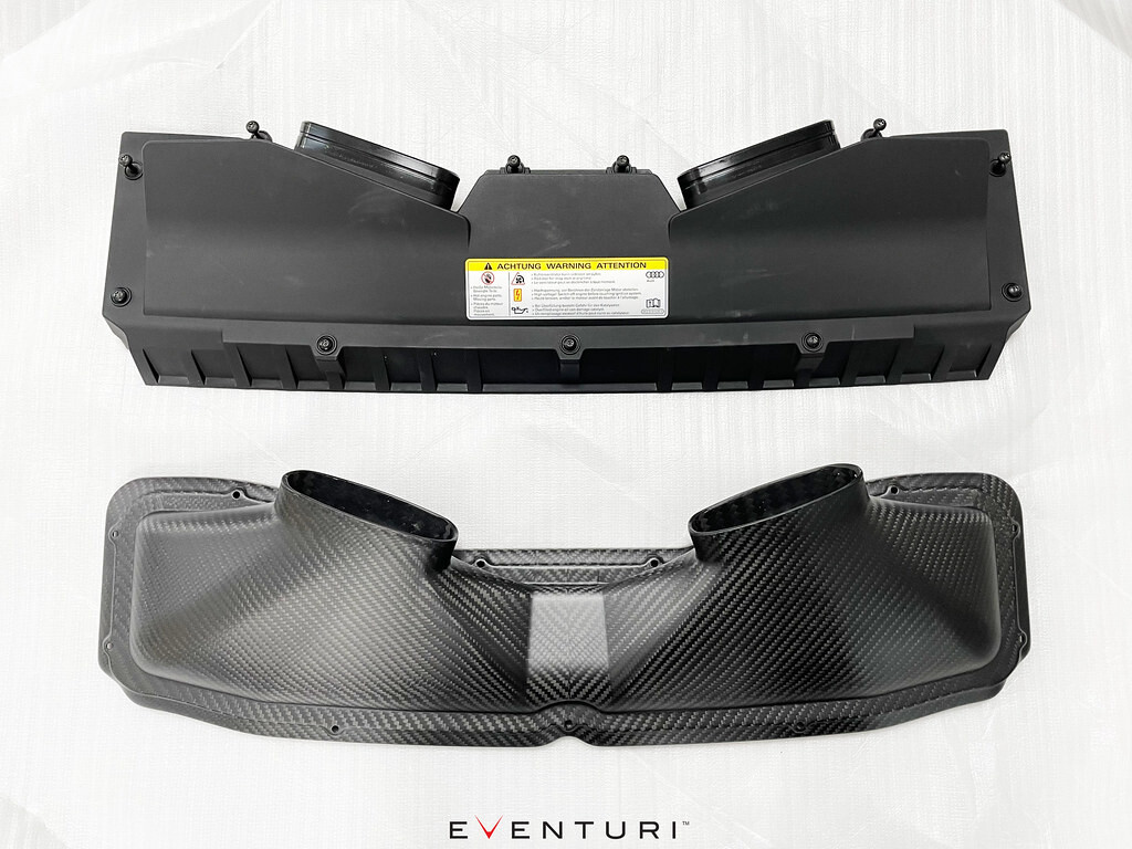 Pro karbonové sání Eventuri byla kompletně přepracována spodní část airboxu Audi RS6 / RS7 a to včetně základny pro uložení filtru, který má v případě Eventuri zcela nový tvar. Kryt chladičové stěny a spodní díl airboxu nyní tvoří jeden celek, u kterého došlo k navýšení objemu pro zvětšení průchodnosti vzduchu. Základna pro filtr je navíc vytvarovaná tak, aby byl samotný filtr usazen ve vhodnějším úhlu pro přísun vzduchu k turbodmychadlům. Tam, kde továrně umístěný filtr nutí vzduch provést 2x zlom 90 stupňů, vede sání Eventuri čerstvý vzduch mnohem přímější cestou.