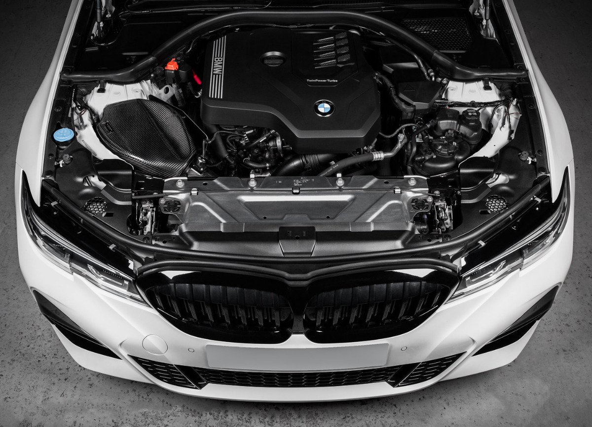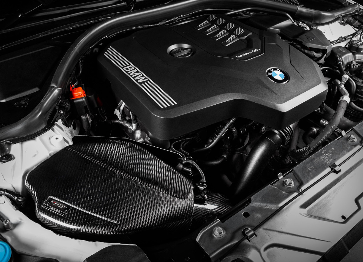 Eventuri kit sání pro BMW řady 3 G20 s motorem B48 je dalším z kompletních systémů vedení nasávaného vzduchu do motoru. Jedná se o kompletně uzavřený kit sání, který zajišťuje, že turbodmychadlo nenasává horký vzduch z motorového prostoru. Celé sání je navrženo tak, aby přivádělo vzduch do motoru co možná nejméně restriktivní cestou. Protože je sání umístěno továrně v blízkosti výfukových svodů, je pro jeho funkci zcela zásadní přívod čerstvého vzduchu, který spolu s airboxem z prepreg karbonu udržuje teplotu nasávaného vzduchu na minimální možné úrovni. Kromě továrního přívodu vzduchu využívá Eventuri další zdroj v podobě otvoru v podběhu kola. Proti výfukovým svodům pak míří i tepelný štít se zlatou reflektivní tepelnou izolací.