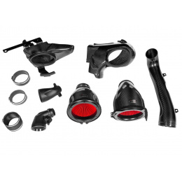 Maximálním využitím prostoru pod kapotou, který nově vyplňují karbonové airboxy s patentovaným tvarem a reverzně umístěnou filtrační vložkou, se zvětšila filtrační plocha o 40% oproti továrním filtrům. Vnější obal airboxu funguje jako redukce průměru až po vstup do turba, takže vzduch proudí plynule a bez restrikcí. Samotné vstupy do turbodmychadel jsou pak větší dokonce o 160% oproti továrním a na vnitřní straně mají unikátní ďolíčkový povrch, díky kterému nedochází ke zpomalování proudění vzduchu vlivem tření s vnitřní stěnou. Vzduch tak proudí rychleji do turbodmychadel a nedochází ke ztrátě tlaku.