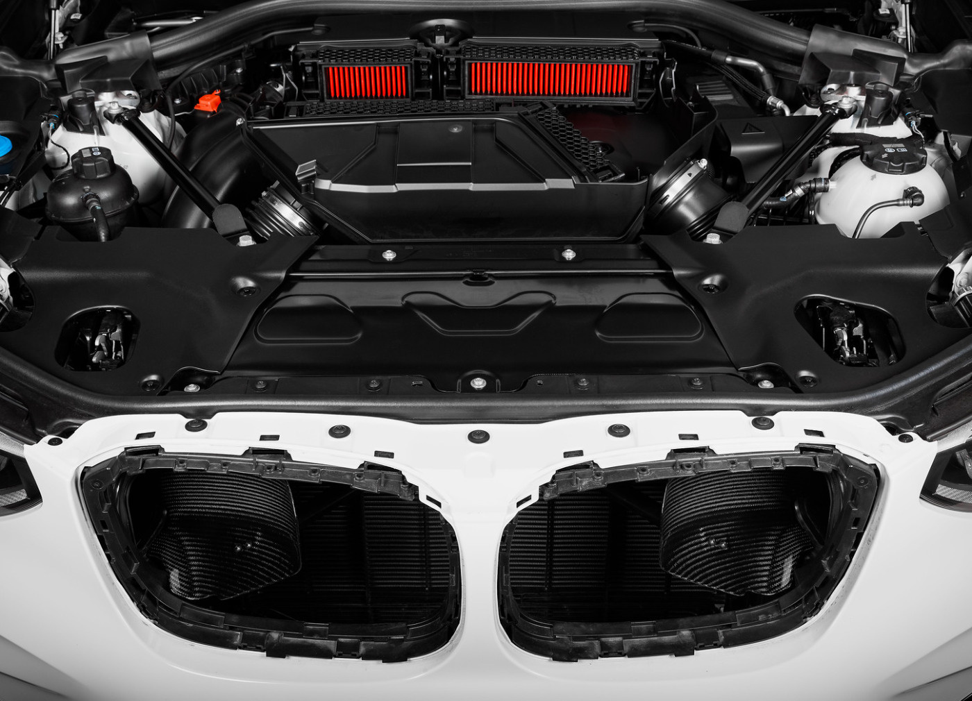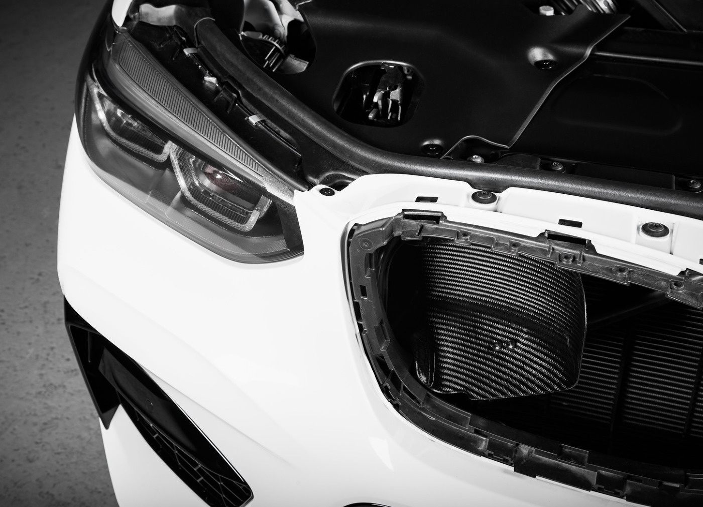 Posledním karbonovým dílem z kitu sání Eventuri pro BMW X3M / X4M je dvojice difuzorů umístěných za maskou chladiče (ledvinami). Tyto difuzory slouží jako lapače čerstvého vzduchu, který je přiváděn do airboxu a pomáhá snižovat teplotu nasávaného vzduchu.