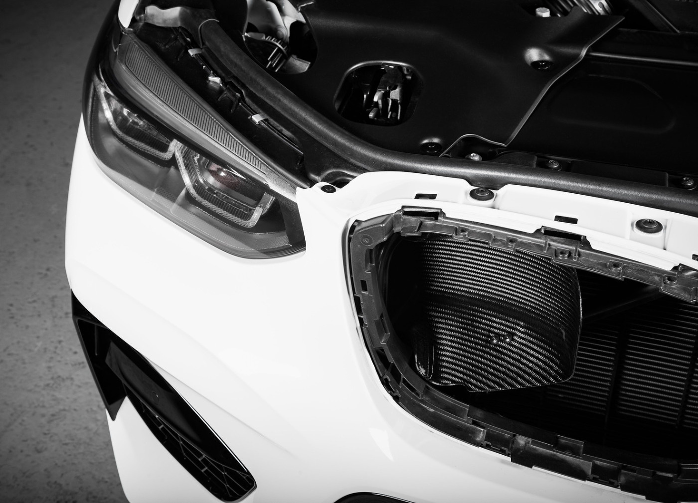 Posledním karbonovým dílem z kitu sání Eventuri pro BMW X3M / X4M je dvojice difuzorů umístěných za maskou chladiče (ledvinami). Tyto difuzory slouží jako lapače čerstvého vzduchu, který je přiváděn do airboxu a pomáhá snižovat teplotu nasávaného vzduchu.