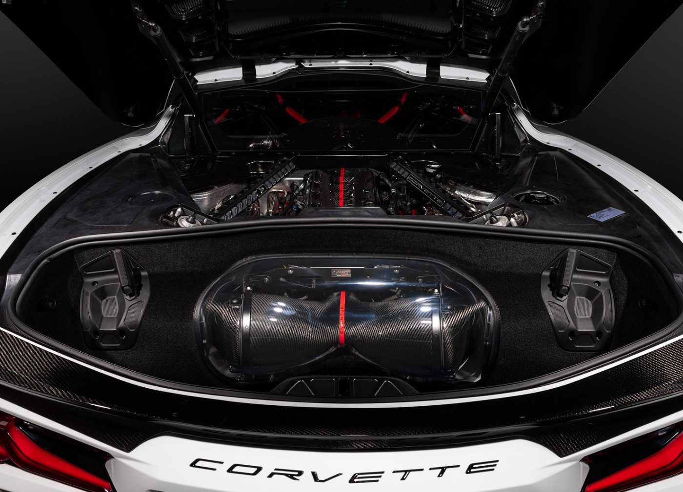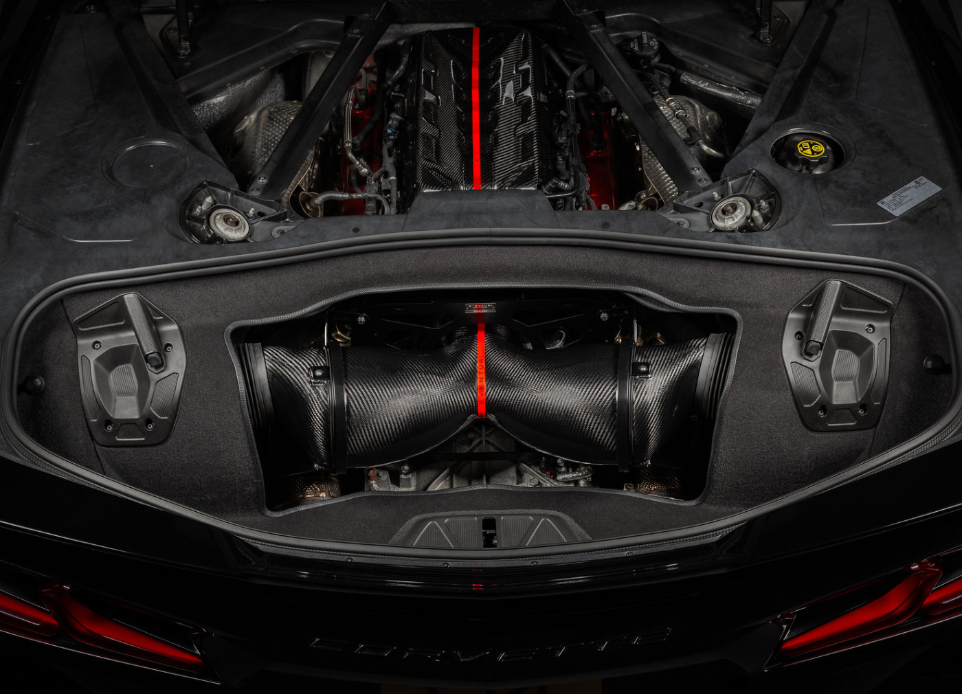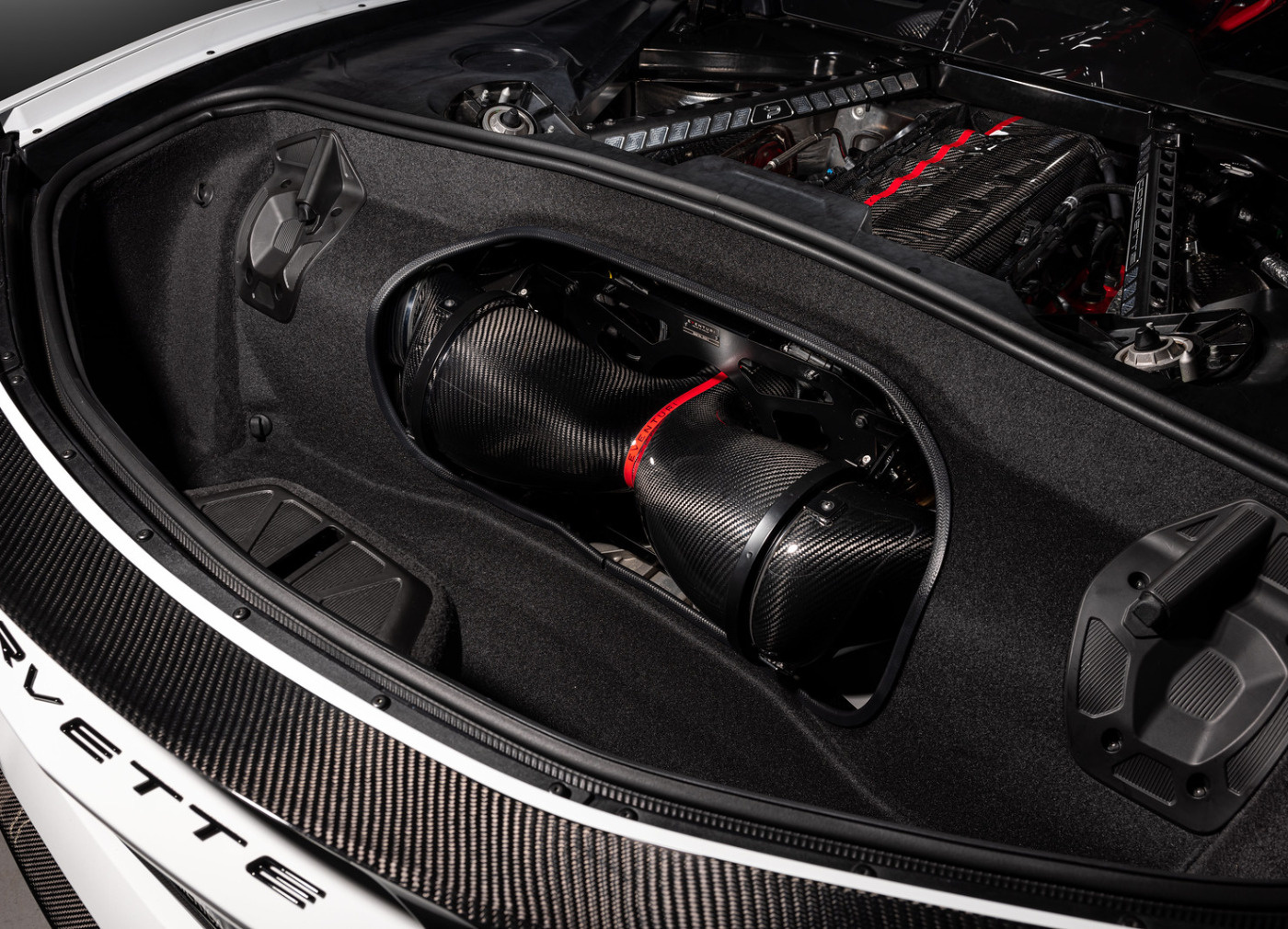 Také sání pro Corvette C8 využívá hned dvojici airboxů s patentovaným tvarem a obráceně umístěnými vzduchovými filtry. Vzduch tak proudí sáním bez prudkých nežádoucích restrikcí a díky uzavřené konstrukci ze 100% karbonu nedochází k pronikání horkého vzduchu do sání.