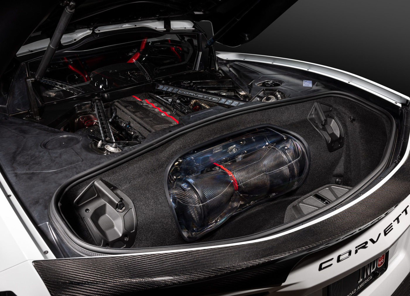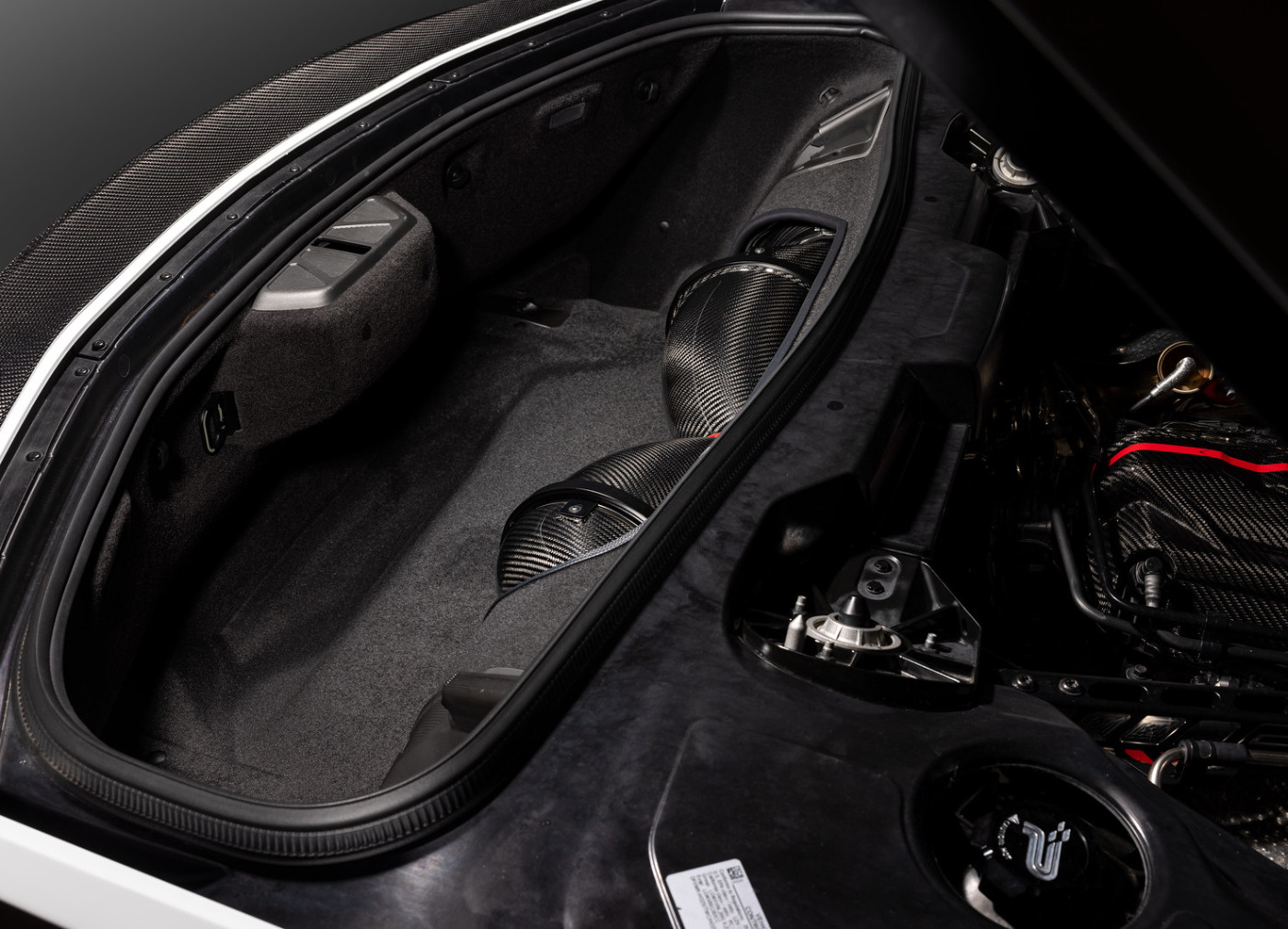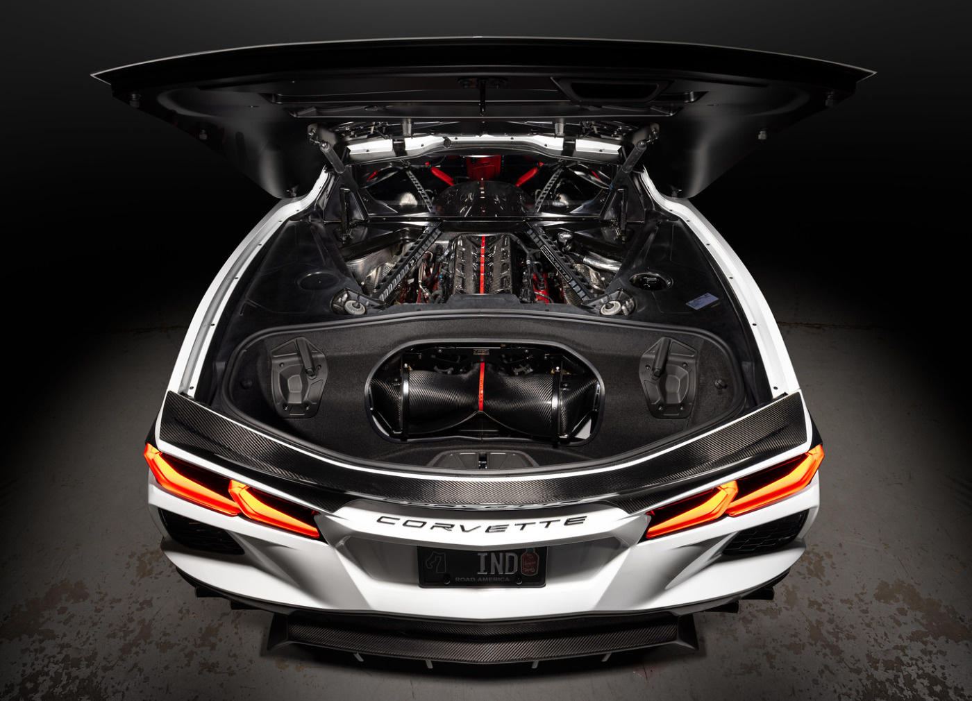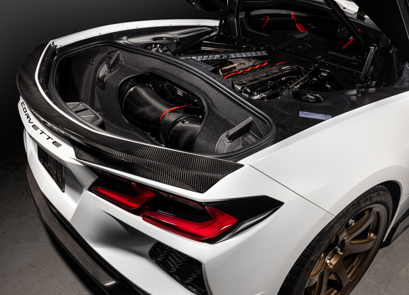 Také sání pro Corvette C8 využívá hned dvojici airboxů s patentovaným tvarem a obráceně umístěnými vzduchovými filtry. Vzduch tak proudí sáním bez prudkých nežádoucích restrikcí a díky uzavřené konstrukci ze 100% karbonu nedochází k pronikání horkého vzduchu do sání.