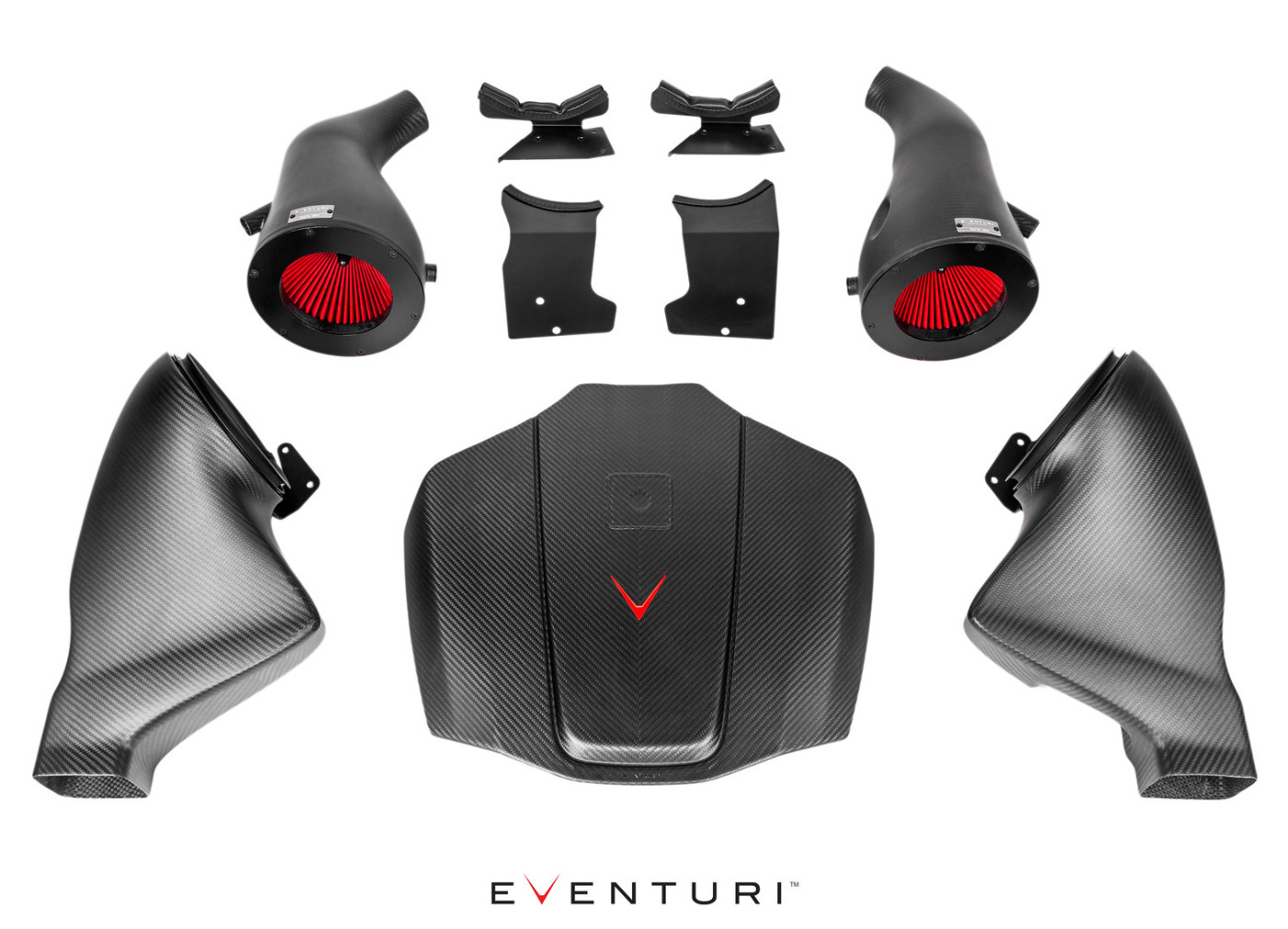 Kit sání Eventuri pro Mercedes AMG GTR / GTS / GT je plně uzavřeným kitem sání využívajícím patentovaný tvar airboxů, který umožňuje nejpřímější možné vedení vzduchu k turbodmychadlům. Každý airbox obsahuje sportovní vložku vzduchového filtru vyrobenou dle vlastního návrhu a splňující nejpřísnější nároky na filtraci. Airboxy využívají na maximum dostupný prostor pod kapotou. Kvůli tomu Eventuri vyrobilo i vlastní středový kryt, který je rozměrům airboxů přizpůsobený. Systém je pak v přední části vybaven nasávači čerstvého vzduchu, které navazují na nasávače v masce chladiče. Sání bylo nezávisle testováno firmou RENNtech, která platí za naprostou špičku mezi úpravci vozů Mercedes Benz / AMG. Kit sání je dodáván jako komplet včetně středového krytu, který má na sobě přípravu pro originální plaketu AMG.
