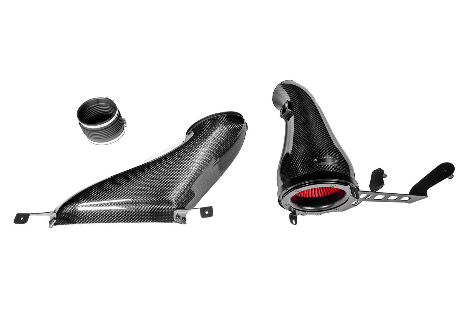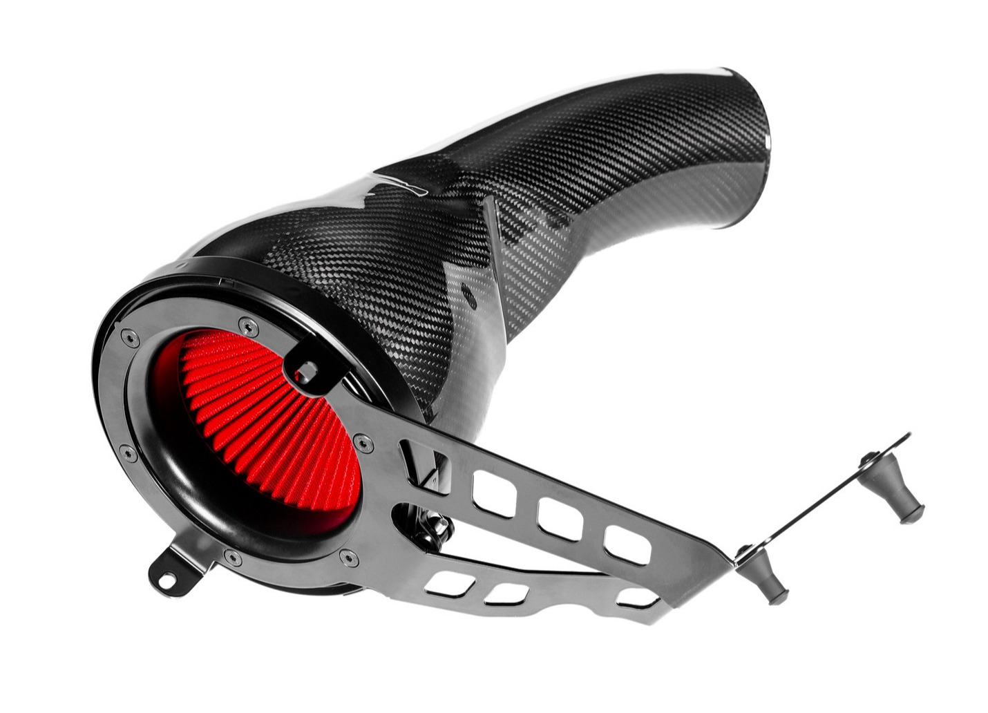 Karbonový nasávač čerstvého vzduchu odvádí vzduch nasávaný v originálním místě předního nárazníku do samotného airboxu. Oproti originálnímu dílu se tak ale děje s optimálnějším prouděním. Tvar nasávače napomáhá přirozenějšímu proudění vzduchu a účinnost nasávání čerstvého vzduchu je tak podstatně vyšší. K airboxu doléhá nasávač přes gumové těsnění, které absorbuje vibrace motoru a utěsňuje sací prostor. Celý nasávač je pak v motorovém prostoru uchycený v originálních montážních bodech pomocí skrytého spojovacího materiálu pro co nejčistší instalaci a finální vzhled.
