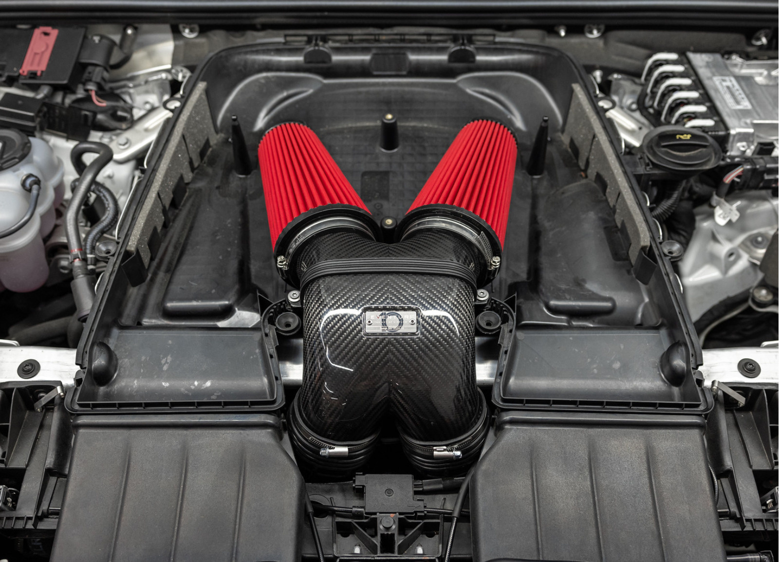 Karbonové sání Eventuri pro motory 4.0TFSI V8 EA825 je kompletním redesignem továrního vedení vzduchu až k turbodmychadlům. Nyní bylo sání přizpůsobeno také pro nejnovější model 2025+. Každý komponent včetně horního krytu je navržený tak, aby zásoboval turbodmychadla maximem čerstvého vzduchu bez restrikcí a díky tomu sání dosahovalo špičkových výsledků pro tuto platformu. Originální airbox omezoval proudění vzduchu svým objemem. Ten narostl díky použití nového horního víka z prepreg karbonu. Větší objem umožnil také použití větších vzduchových filtrů. Konkurenční výrobci do krytu zpravidla nezasahují a zůstává jim tak omezený prostor pro vzduchové filtry a pracují s menší zásobou vzduchu.