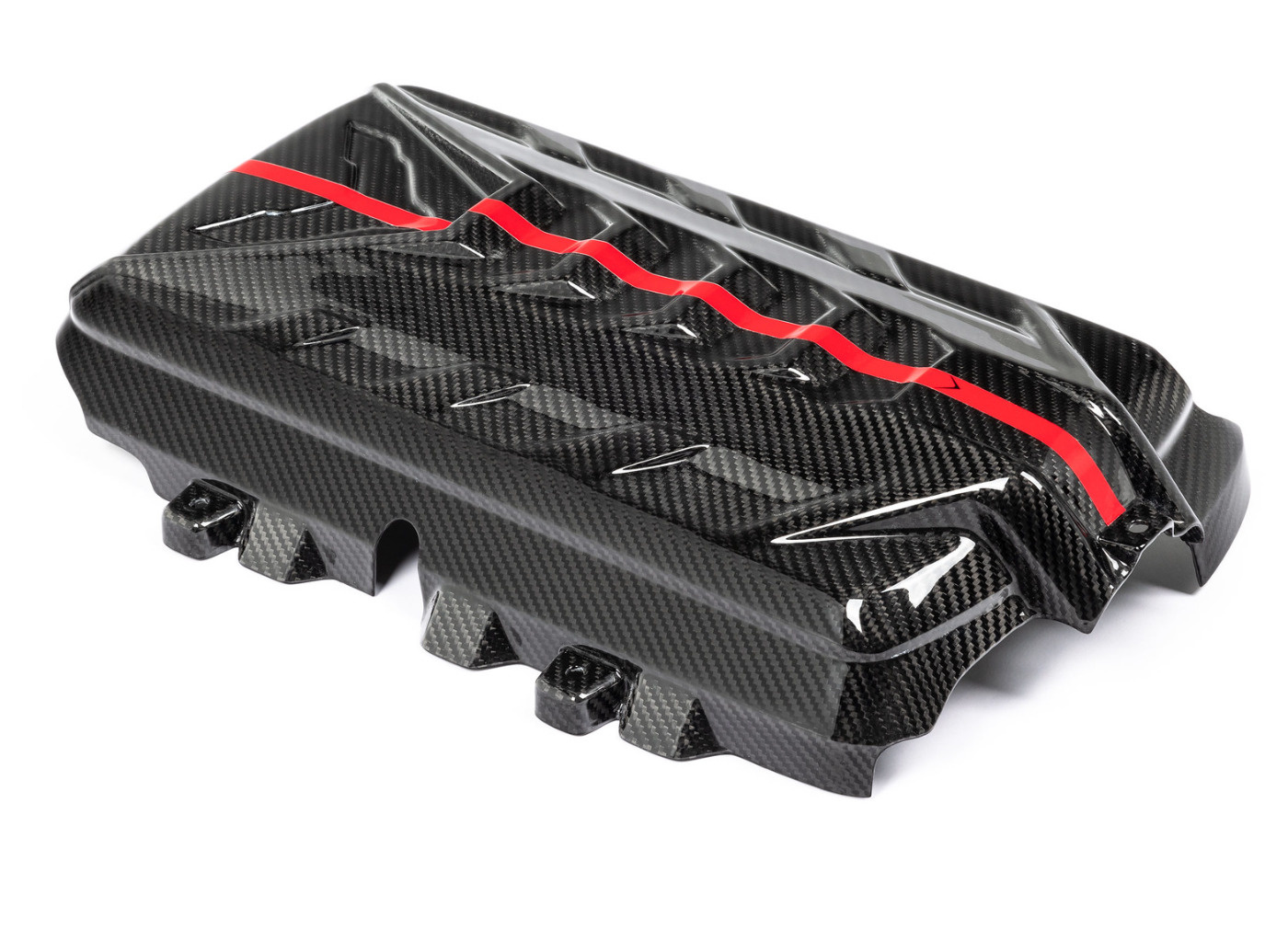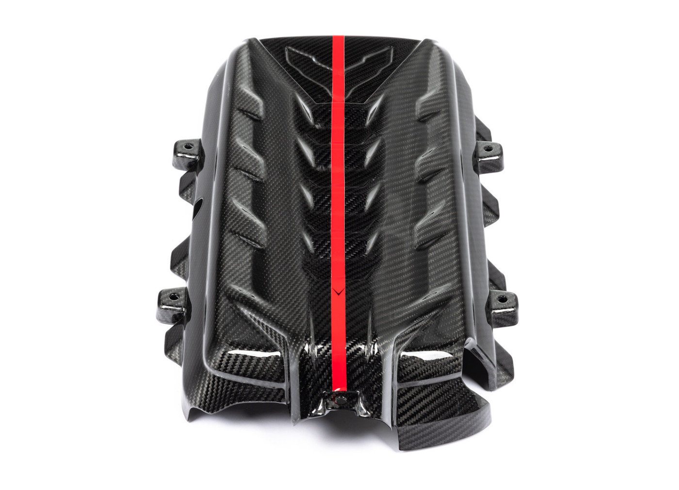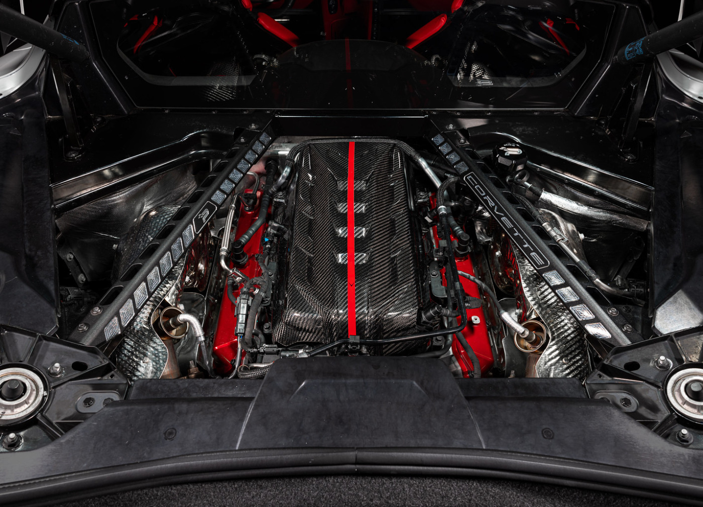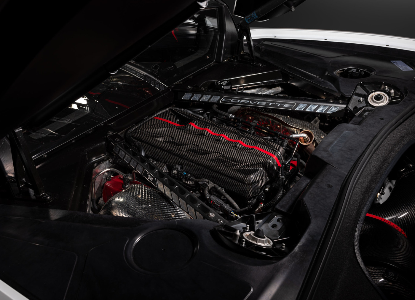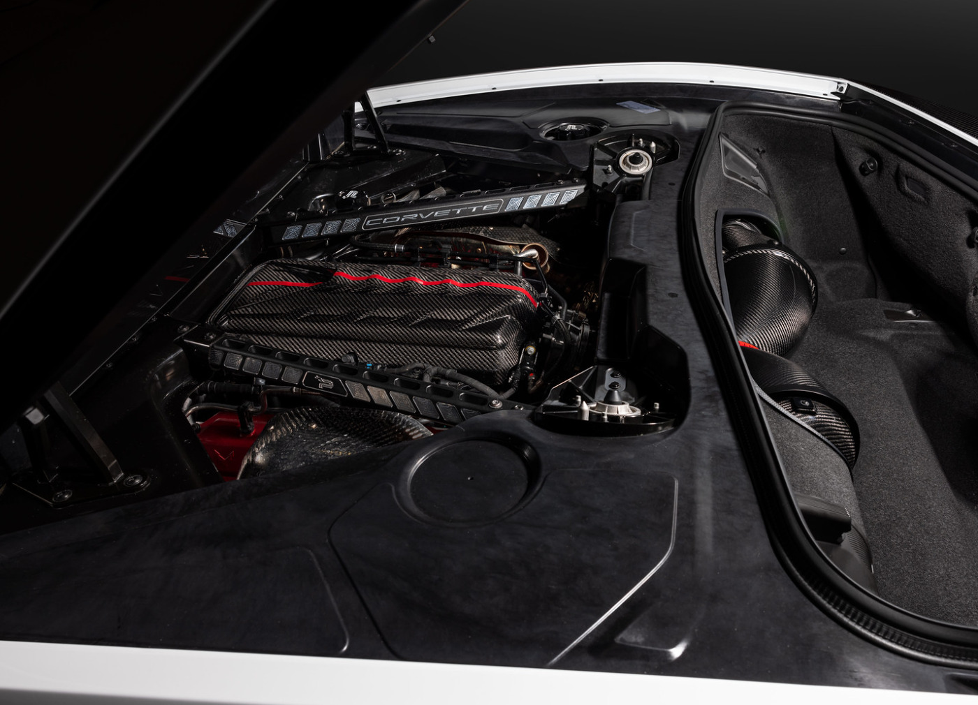 Karbonový kryt motoru Eventuri pro Chevrolet Corvette C8 je vyrobený ze 100% prepreg karbonu s lesklým povrchem a doplněný o červenou linku s logem Eventuri. Tento grafický prvek plynule navazuje na karbonové sání Eventuri, které je pro vůz také dostupné.