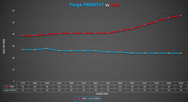 Rozdíl teplot nasávaného vzduchu OEM vs Forge Motorsport intercooler