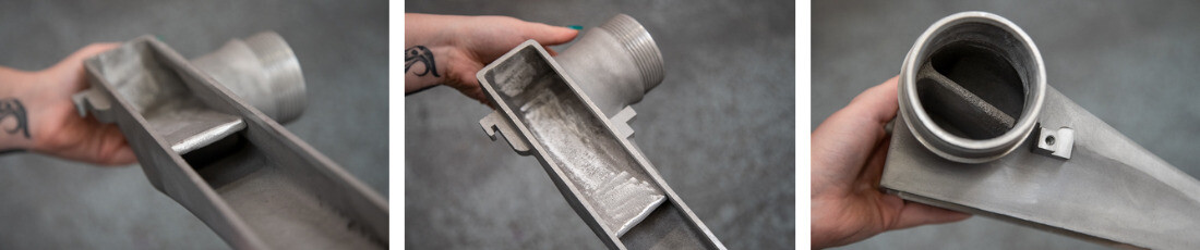 Po zvětšení průměrů intercooleru se pozornost Forge Motorsport zaměřila na navazující silikonové hadice. Ty byly vytvořeny se stupňovitým vstupem tak, aby po nasazení na příruby intercooleru vznikl zcela plynulý přechod bez turbulencí. Silikonové vedení navazuje průměrem 76 mm na nové příruby, což oproti továrním 63 mm znamená: