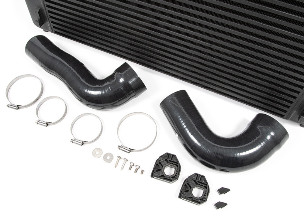 Tovární chladicí sestava (vodní chladič, chladič klimatizace a další dílčí výměníky) téměř kompletně vyplňuje rám předního čela, takže pro zvětšení intercooleru zbývá jen minimum prostoru. Forge Motorsport proto postupoval cestou maximální optimalizace stávajícího místa po sériovém intercooleru.
