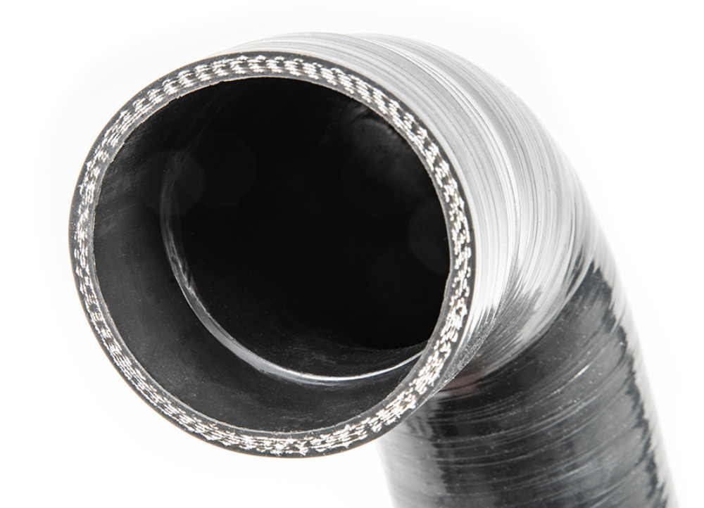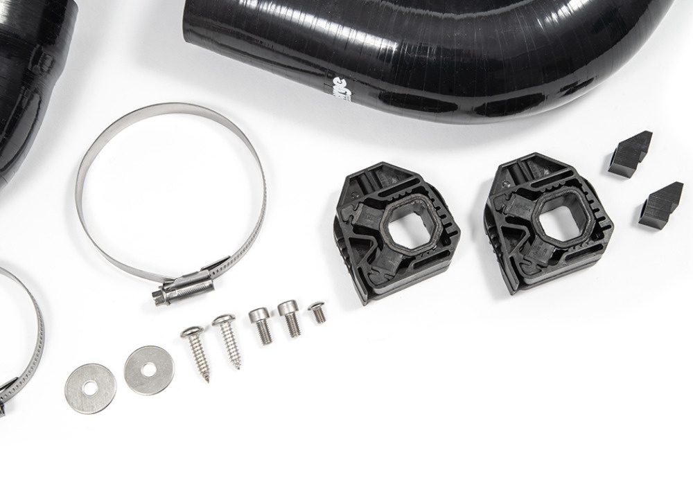 Po zvětšení průměrů intercooleru se pozornost Forge Motorsport zaměřila na navazující silikonové hadice. Ty byly vytvořeny se stupňovitým vstupem tak, aby po nasazení na příruby intercooleru vznikl zcela plynulý přechod bez turbulencí. Silikonové vedení navazuje průměrem 76 mm na nové příruby, což oproti továrním 63 mm znamená: