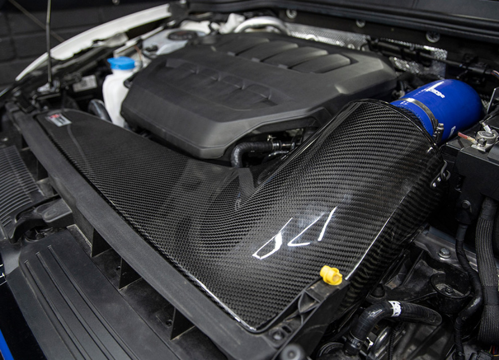 Kit sání Forge Motorsport využívá celé šířky panelu pro nasávání čerstvého vzduchu, do kterého se elegantně zasouvá. Utěsnění sacího vedení spolu s konstrukcí z prepreg karbonu zajišťuje nízkou teplotu nasávaného vzduchu. Velké množství chladného vzduchu před turbodmychadlem znamená rychlejší odezvu na sešlápnutí plynu a efektivnější využití jednotkou stanoveného poměru vzduchu a paliva.