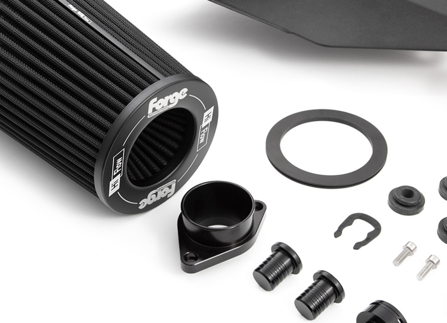 Filtr doplňuje silikonová sací hadice se zvětšeným objemem, hladkou vnitřní stěnou a příruba pro napojení na turbodmychadlo. Hadice je navržena tak, aby vedla vzduch k turbu co nejpřímější cestou bez restrikcí a nežádoucích zlomů. Celkový objem vedení vzduchu je u Forge větší o 50 % oproti sérii a v místě vstupu do turba narostl objem o 46 %. Výsledkem je lepší odezva na plyn a výraznější zvukový projev vozu.