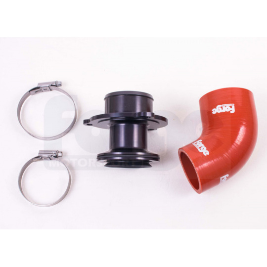 Sada obsahuje: přírubu z kovaného hliníku frézovanou pomocí technologie CNC, silikonovou hadici v červené barvě a potřebné hadicové spony. Uchycení příruby je pomocí tří montážních bodů, což zamezuje jakýmkoliv možným rezonancím.