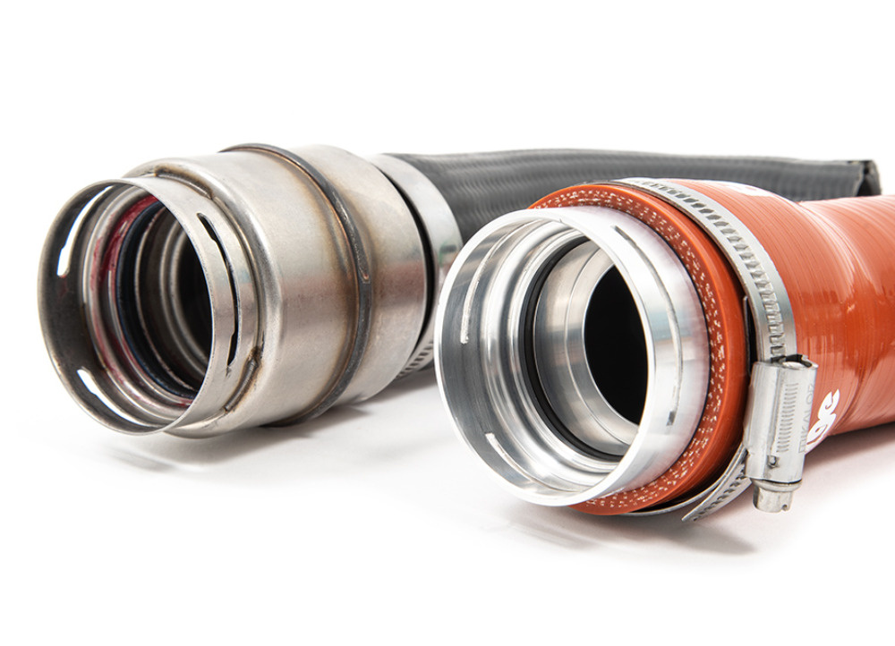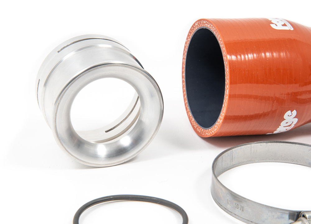 Navíc, komu by vadilo poslechnout si za jízdy zvukový projev turbodmychadla? Originální přepážková komora tak byla kompletně nahrazena CNC soustruženým adaptérem, který vede hladce vzduch z turbodmychadla do intercooleru. Gumová hadice je pak nahrazená silikonovým dílem, který odolává vysokým teplotám, tlaku a projevům stárnutí.