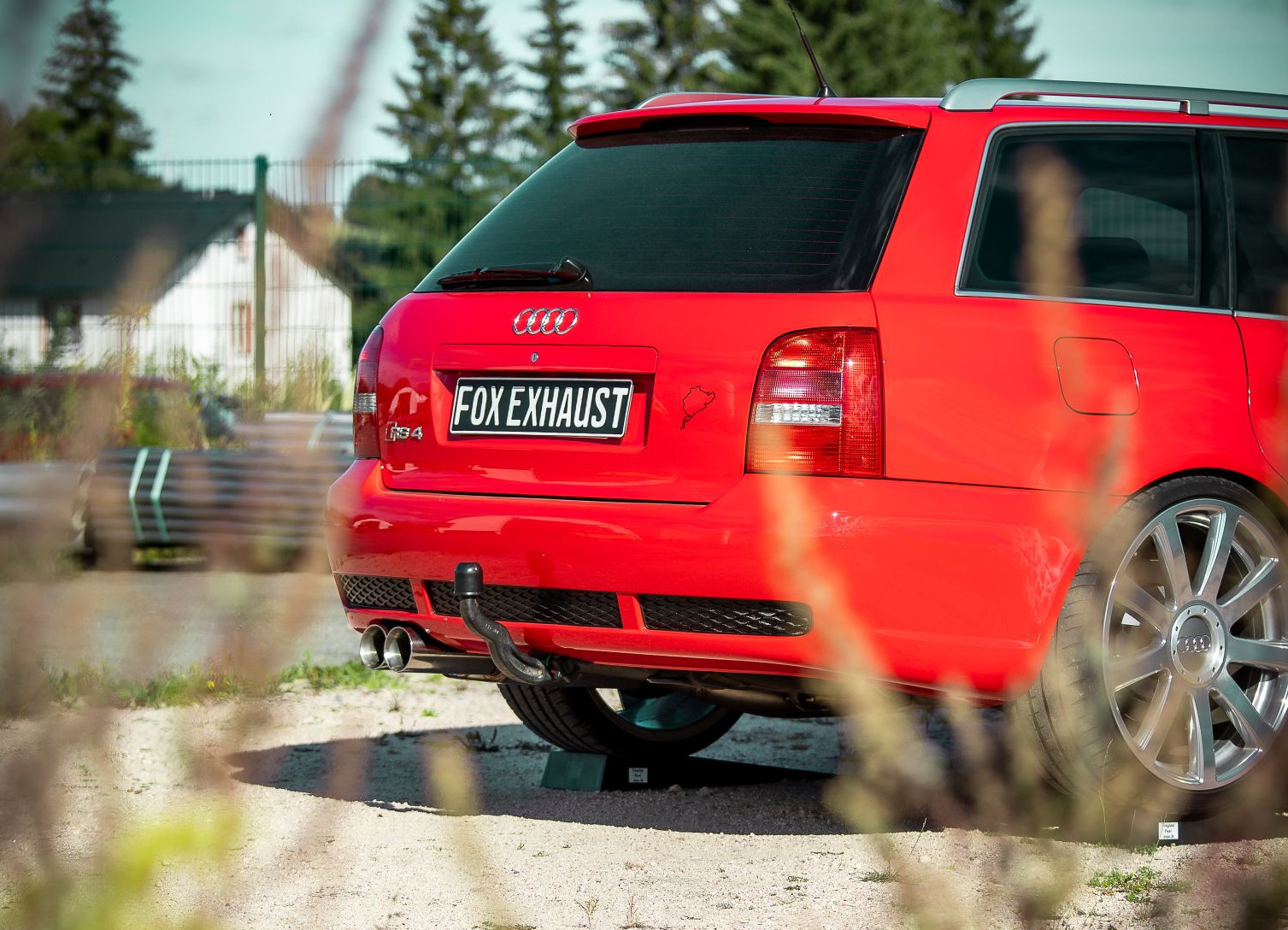 Fox Sportauspuff koncový a středový tlumič včetně Y-adaptéru pro připojení na 76mm downpipe s koncovkou 2x90 Typ 25 dvojitá pro Audi S4 B5 s motorem 2.7