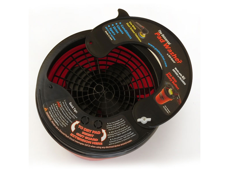 Pračka Grit Guard Universal Pad Washer nabízí jednoduchý způsob, jak vyčistit a obnovit lešticí kotouče a prodloužit jejich životnost. Bez nutnosti sundávat kotouč jej po leštění snadno a bez námahy připravíte pro další použití. Patentovaný mechanizmus unitř kbelíku je navržen tak, aby mytí kotouče co nejvíce ulehčil. Pružiny tvoří ideální protitlak, aby se kotouč vyčistil, ale nepoškodil. Universal Pad Washer lze použít také pro sušení kotoučů.