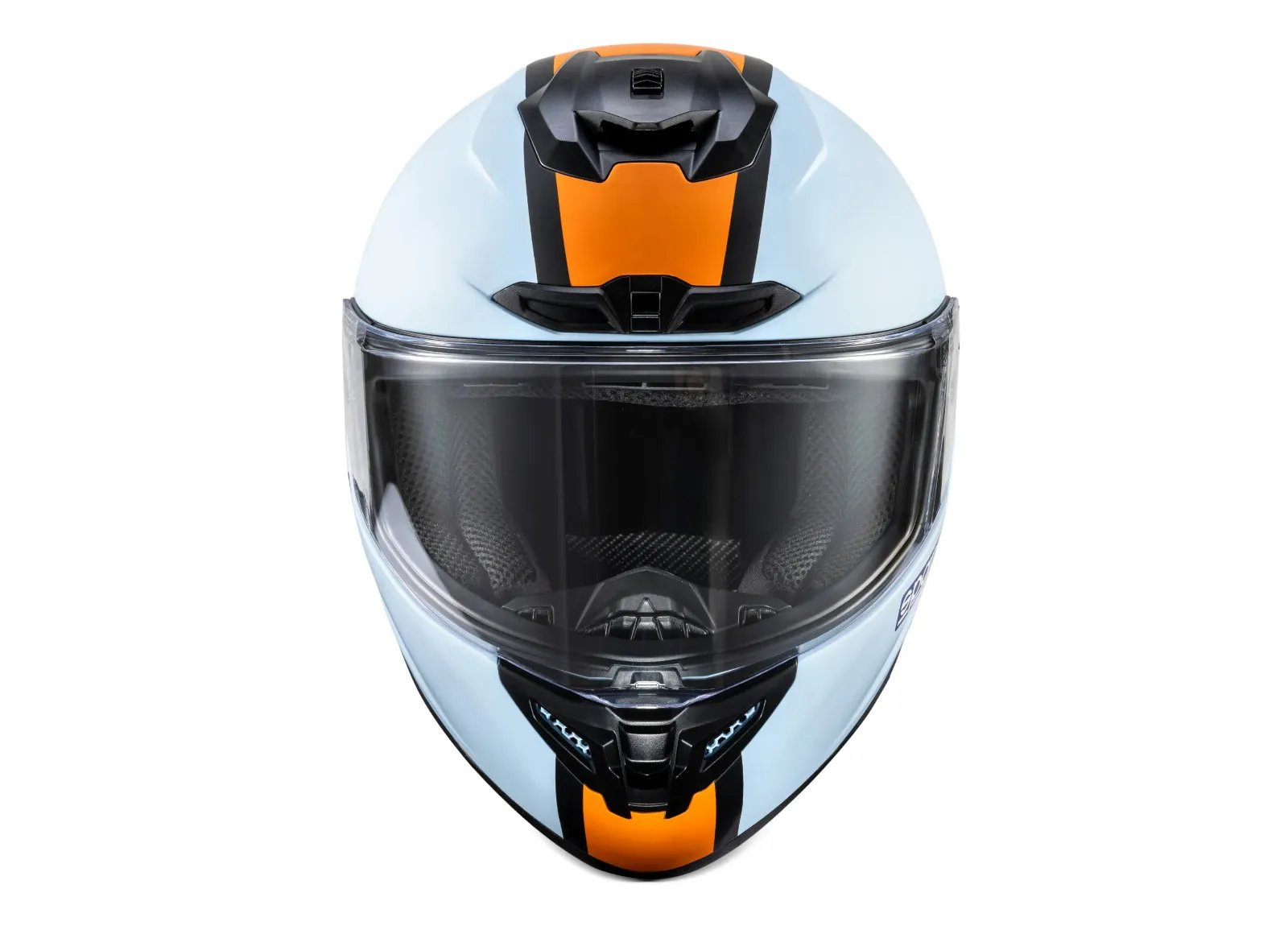 Ikonické modro-oranžové barevné schéma odkazuje na historii motoristického sportu a dodává helmě výrazný závodní vzhled.