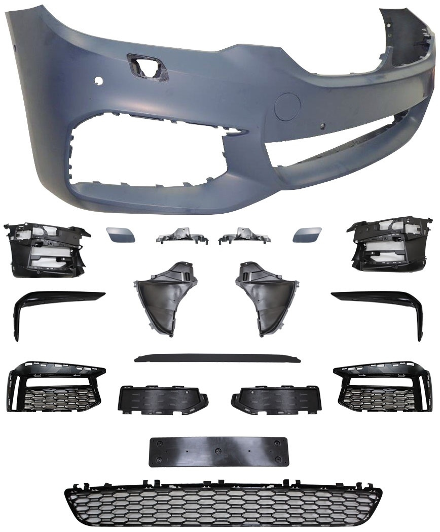 Přední nárazník M-paket Look pro BMW 5, G30 sedan a G31 touring před facelift (2017-2020) má perfektní zpracování a jednoduchou montáž výměnou za originální nárazník. Nárazník je vhodný pro vozy s PDC (parkovací čidla), bez SRS (ostřikovačů světel).