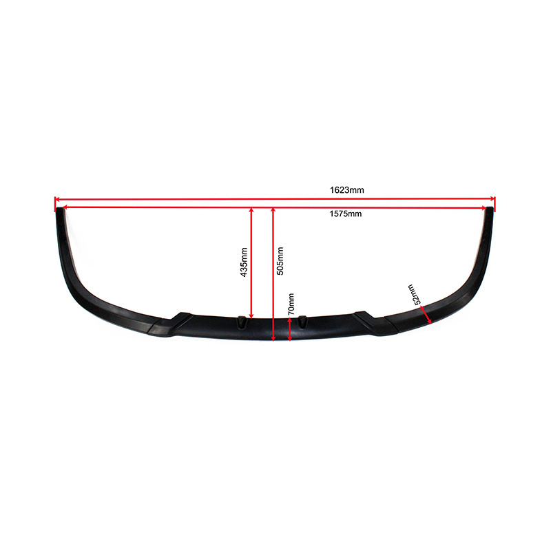 Jedná se 3-dílný univerzální spoiler, vyrobený z černého matného plastu. Přesné rozměry uvedeny v obrázcích. Spoiler se dá do určité míry natvarovat či přizpůsobit danému nárazníku a přišroubovat šroubky, které jsou součástí balení.