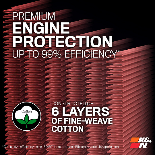 Navrženo pro náročné závodní tratě – vyrobeno pro váš civilní vůz. Vícevrstvá bavlna jako filtrační médium poskytuje až o 50% vyšší propustnost vzduchu než běžné papírové filtry. Odolný rám filtru spolu s bavlněným filtračním médiem zajišťují životnost zpravidla překračující životnost vozu, podtrženou zárukou v délce 10 let nebo najetí milionu mil.