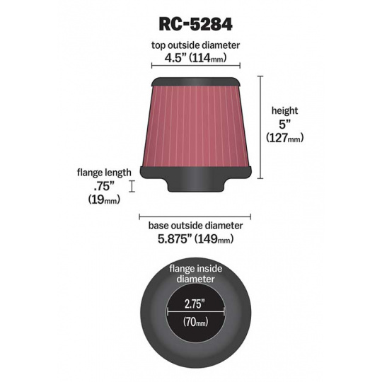 ZÁKLADNÍ ROZMĚRY A PARAMETRY UNIVERZÁLNÍHO FILTRU K&N RC-5284