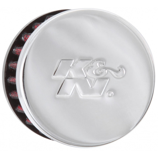 K&N univerzální odvětrávací filtr s vnějším průměrem 51 mm a výškou 38 mm, průměr vstupu 16 mm, délka vstupní příruby 11 mm, materiál Netkaná syntetická textilie, vrchlík kovový vrchlík