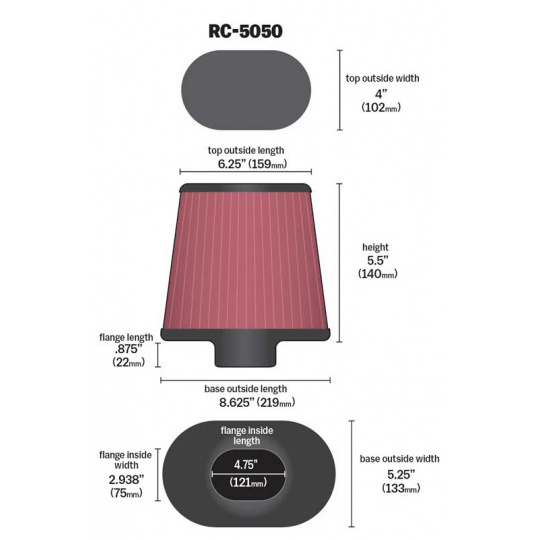 ZÁKLADNÍ ROZMĚRY A PARAMETRY UNIVERZÁLNÍHO FILTRU K&N RC-5050