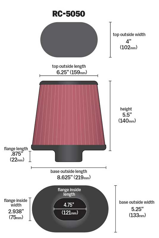ZÁKLADNÍ ROZMĚRY A PARAMETRY UNIVERZÁLNÍHO FILTRU K&N RC-5050