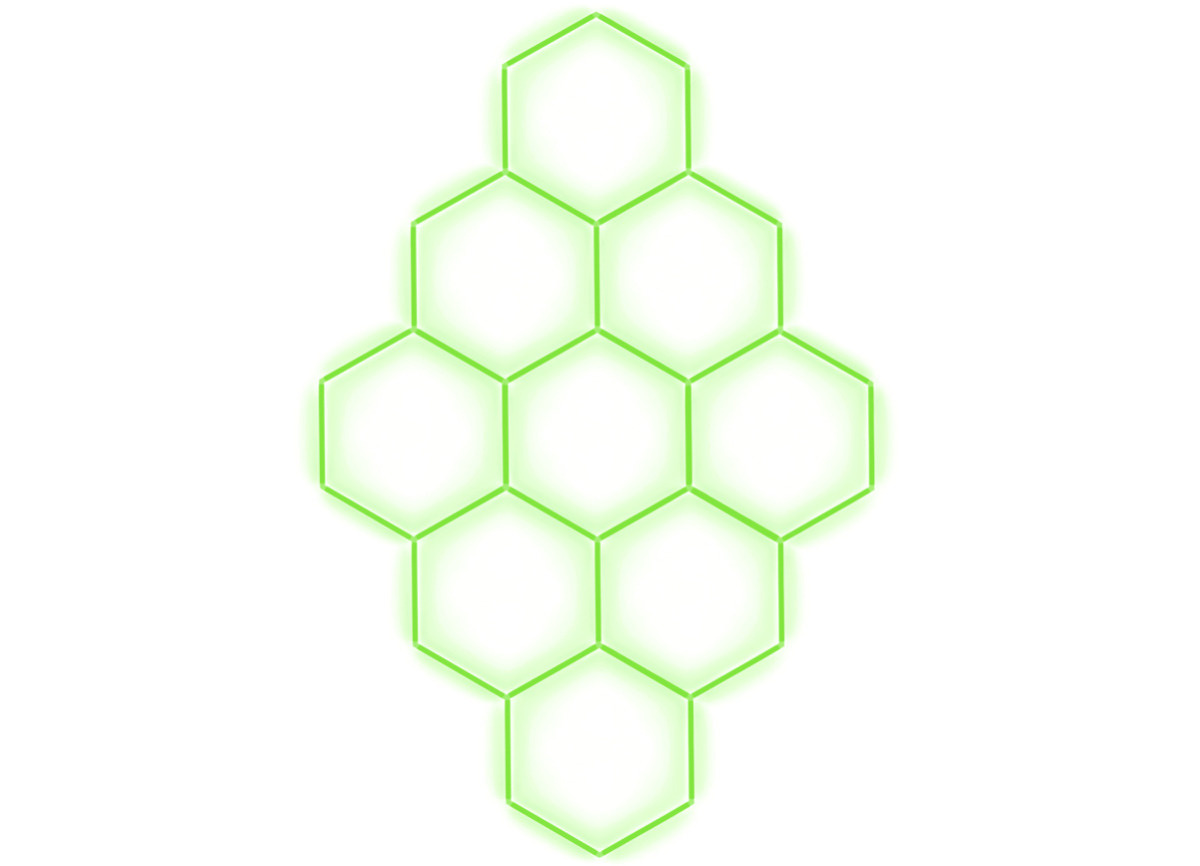 Kompletní LED hexagonové svítidlo zelené, rozměr: 9 elementů 246 x 386 cm