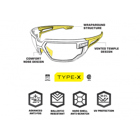 Taktické ochranné brýle Mechanix Vision Type-X splňují vojenský balistický standard MIL-PRF 32432 a normu odolnosti ANSI Z87.1.